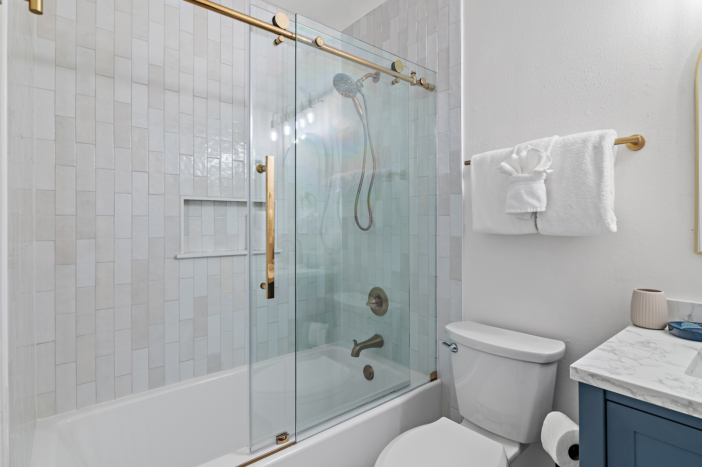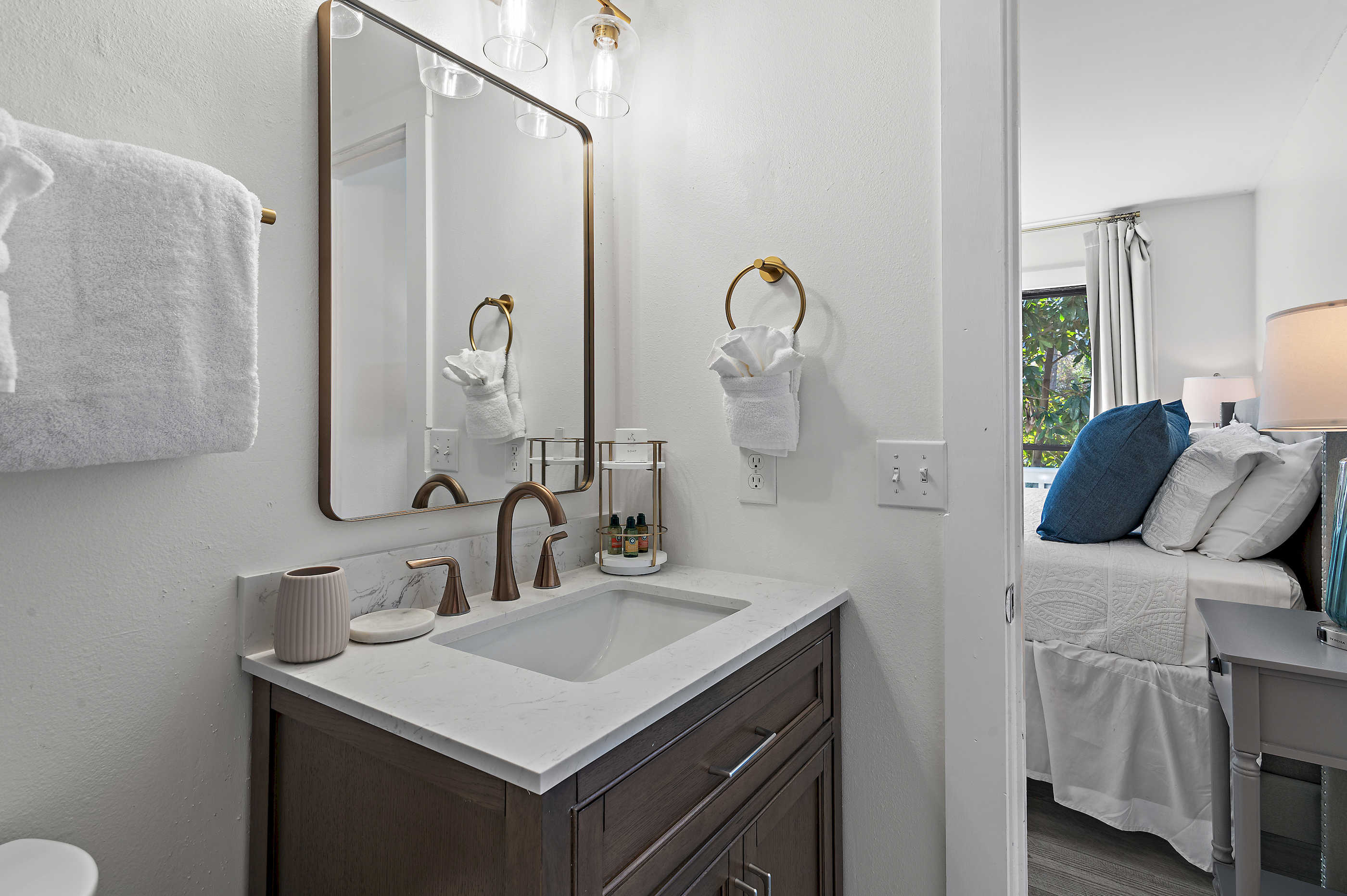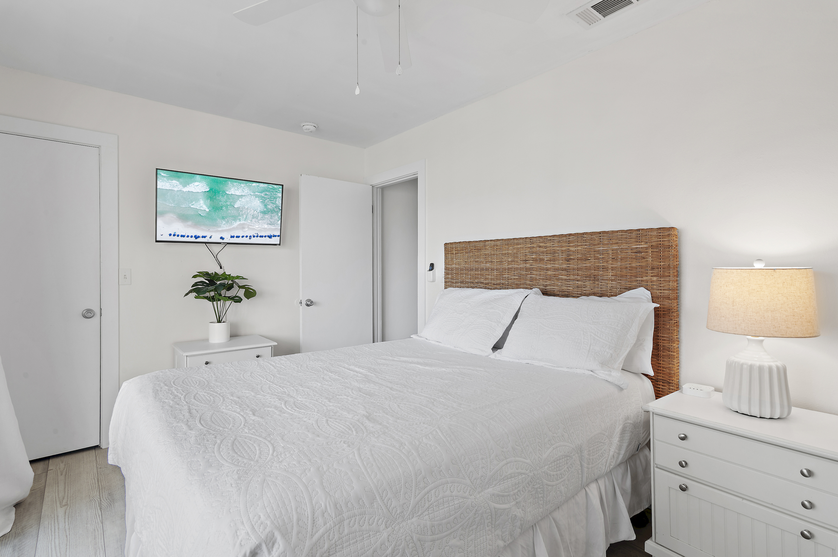 Both bedrooms are equipped with ceiling fans and flat-screen smart TVs for entertainment. An initial supply of essentials like shampoo, paper, and soap products are provided to start your stay off right.
