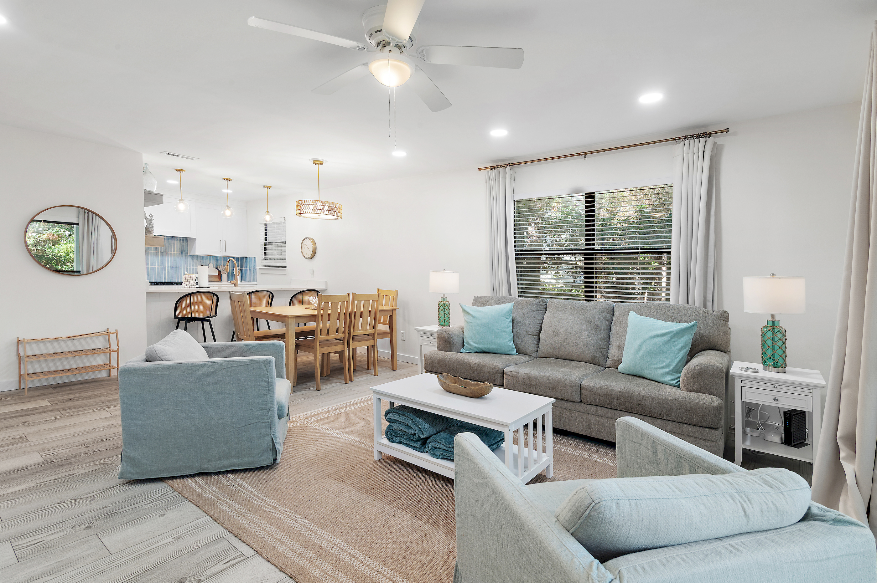 2 Bedrooms • 3 Bathrooms (2 full, 1 half) 3 Baths (2 full, 1 half) • Sleeps 5-6Welcome to your beachside getaway at Cassine Gardens in Seagrove Beach—a serene two-story end-unit townhome with two pools and just a five minute walk from the pristine One Seagrove public beach and its neighboring sands. Perfect for families and beach enthusiasts alike, our home is nestled among a cypress grove and the tranquil backdrop of a state forest, offering not only peace and quiet but also easy access to Seaside, Watercolor, Grayton, Blue Mountain, Rosemary, Alys and Seacrest Beaches.